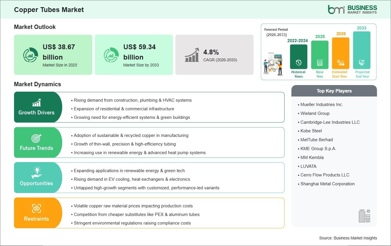 How big is the Copper Tubes Market? The market is valued at US$ 38.67 billion in 2025 and is projected to reach US$ 59.34 billion by 2033.
