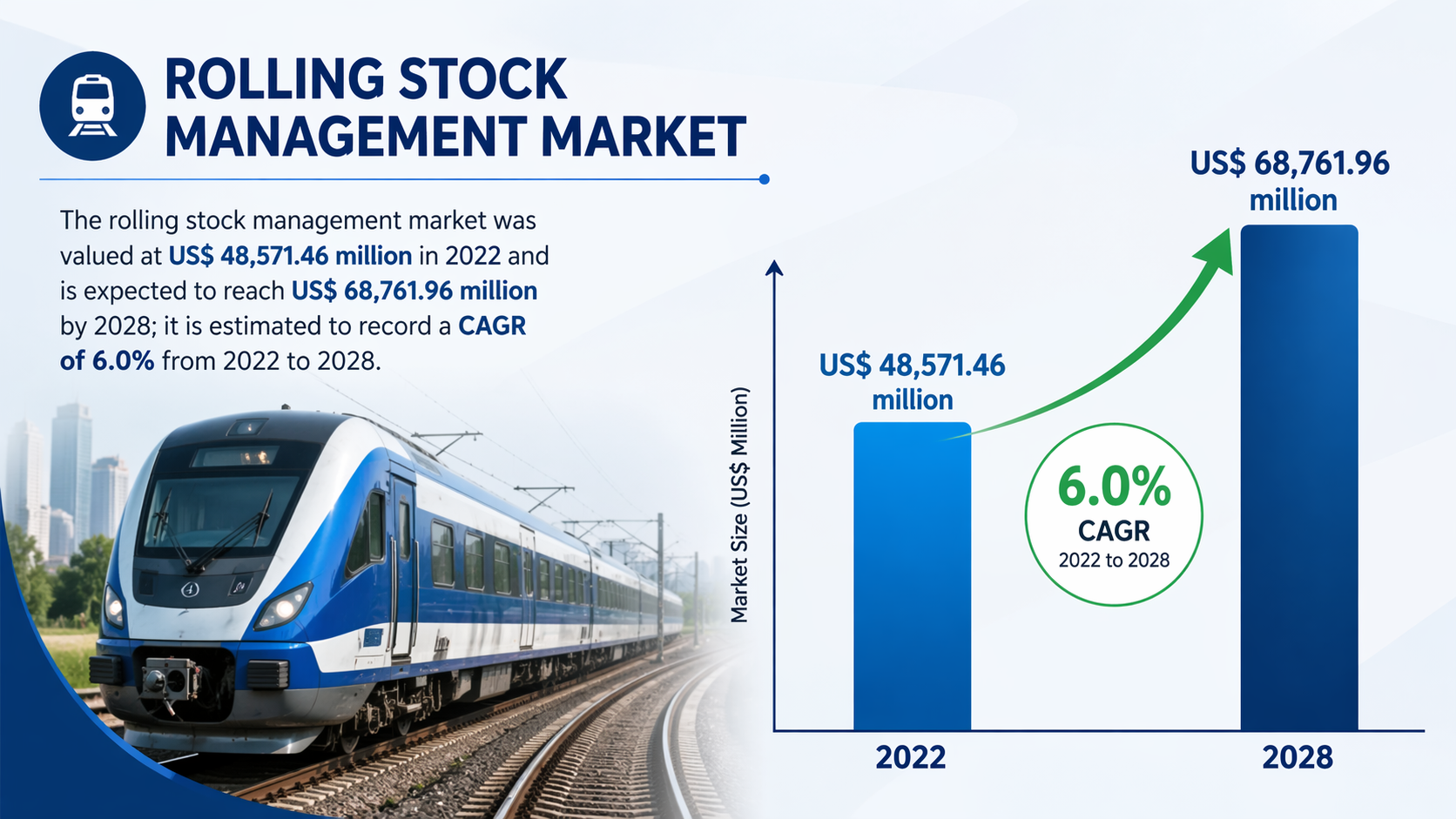 The global rail industry is currently navigating a period of rapid modernization, where traditional mechanical systems are being replaced by sophisticated digital architectures. Rolling stock management involves the holistic oversight of rail assets, ensuring that locomotives and wagons operate at peak performance while maintaining strict safety standards. According to recent market data, the rolling stock management market was valued at US$ 48,571.46 million in 2022 and is expected to reach US$ 68,761.96 million by 2028; it is estimated to record a CAGR of 6.0% from 2022 to 2028.
