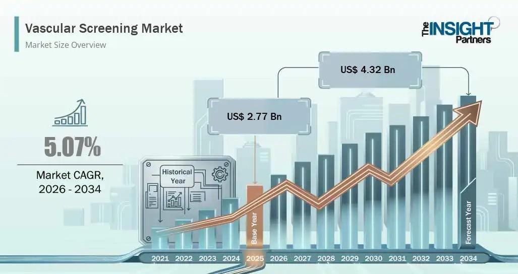 The global vascular screening industry is experiencing steady growth, supported by rising awareness of cardiovascular health and the increasing need for early detection of vascular disorders. According to industry estimates, the market size is projected to reach US$ 4.32 billion by 2034, growing from US$ 2.77 billion in 2025. This expansion reflects a compound annual growth rate of 5.07% during the forecast period from 2026 to 2034. The growing burden of chronic diseases, combined with advancements in diagnostic technologies, is shaping the overall trajectory of the market.