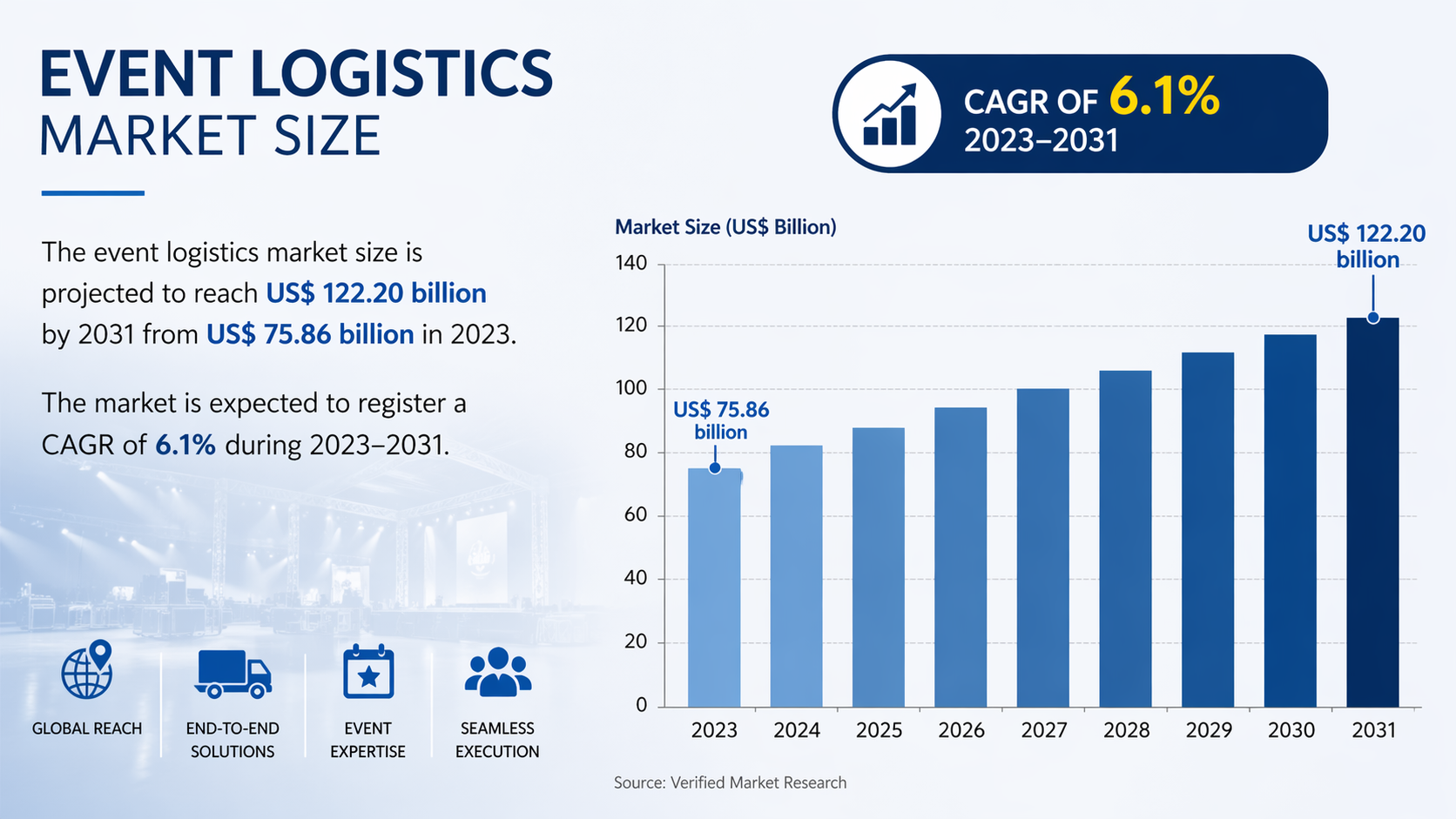 The global industry for managing the movement of goods and equipment for specialized gatherings is undergoing a period of significant transformation. As organizations return to large scale physical activations, the demand for precision in supply chain management has never been higher. According to recent market research, the event logistics market size is projected to reach US$ 122.20 billion by 2031 from US$ 75.86 billion in 2023. The market is expected to register a CAGR of 6.1% during 2023–2031. This steady growth reflects the indispensable nature of logistics in the successful execution of international exhibitions, sports, and entertainment tours.