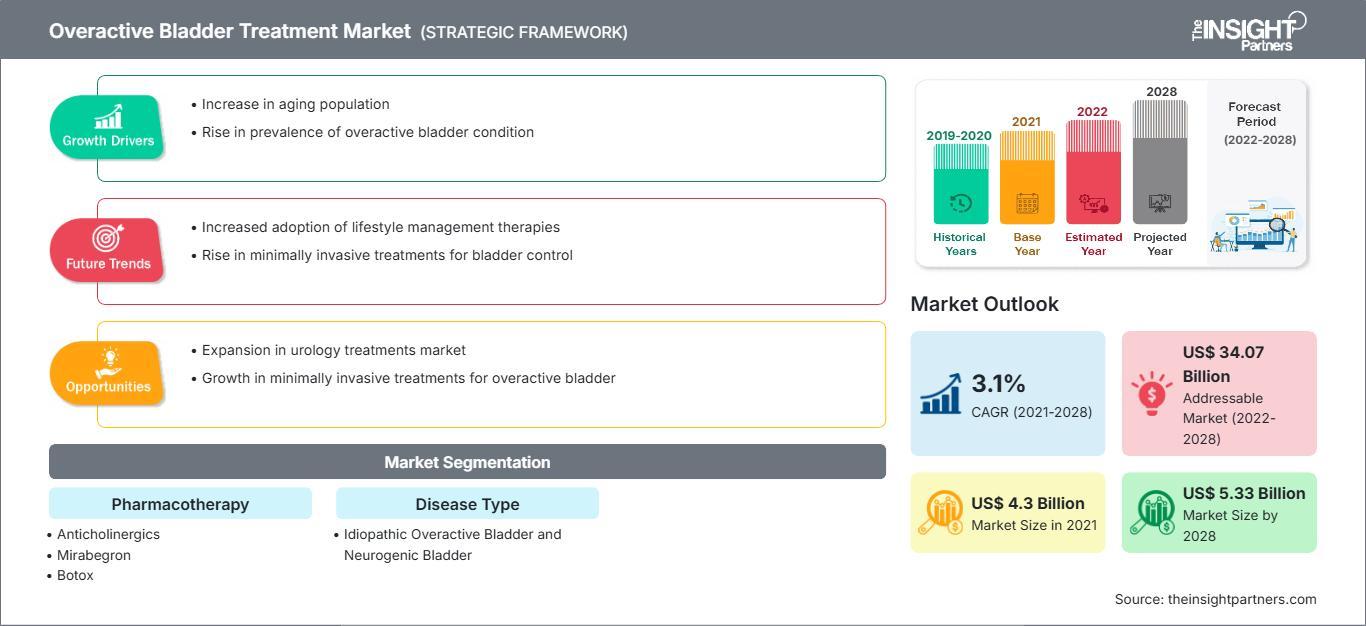 The global overactive bladder treatment market is witnessing steady expansion, driven by rising awareness, increasing prevalence of urinary disorders, and advancements in therapeutic options. The market is projected to grow from US$ 4,295.93 million in 2021 to US$ 5,333.92 million by 2028, registering a CAGR of 3.1% from 2022 to 2028. This consistent growth trajectory highlights the increasing demand for effective treatment solutions and the evolving landscape of urology care. Factors such as an aging population, improved healthcare infrastructure, and the availability of innovative pharmacological therapies are contributing significantly to market expansion.