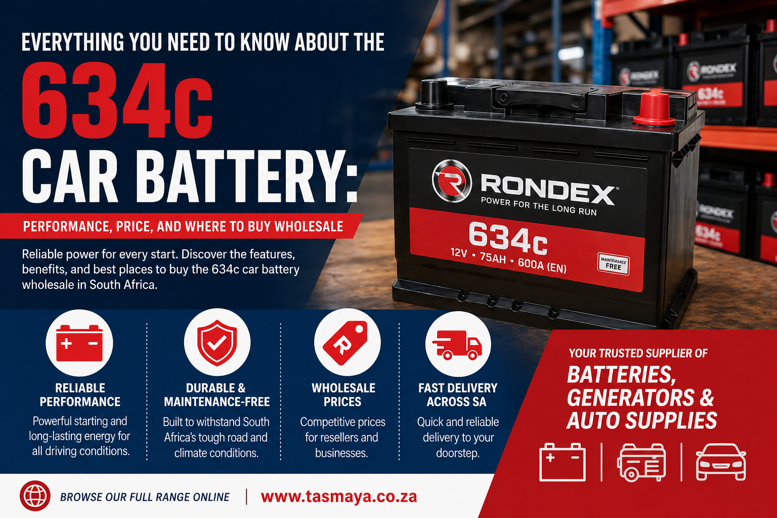 Choosing the right power solutions is easier with Tasmaya. With competitive pricing, a broad selection of products like the trusted 634c car battery, and convenient online shopping across South Africa, your power needs are well taken care of. Fast delivery and a knowledgeable support team further enhance the buying experience.