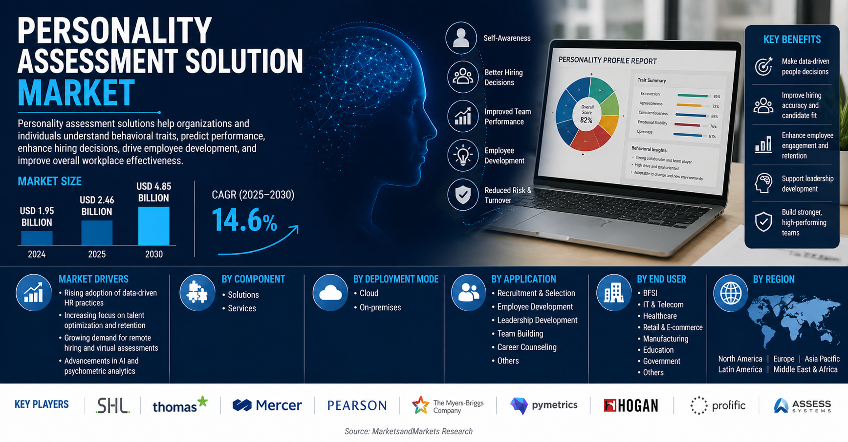 The Personality Assessment Solution Market Scope is gaining significant traction as organizations increasingly prioritize data-driven approaches for recruitment, employee development, and workforce management. Personality assessment solutions are digital tools and psychometric platforms designed to evaluate behavioral traits, emotional intelligence, cognitive abilities, and interpersonal skills. These solutions help employers better understand candidate compatibility, leadership potential, and workplace behavior, enabling improved hiring accuracy and workforce optimization.