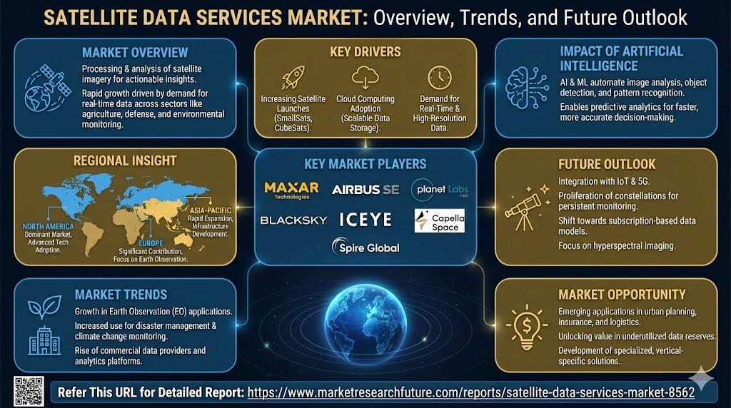 The Satellite Data Services Market has become a foundational pillar for data-driven decision-making across multiple sectors, including defense, agriculture, infrastructure, energy, and environmental monitoring. As highlighted by Market Research Future (MRFR), the global satellite data services market is experiencing sustained expansion due to the increasing reliance on geospatial intelligence and real-time Earth observation data. Organizations worldwide are leveraging satellite-derived information to improve operational efficiency, reduce uncertainty, and enhance strategic planning. the satellite data services market industry is projected to grow from 159.64 USD Billion in 2025 to 474.96 USD Billion by 2035, exhibiting a compound annual growth rate (CAGR) of 11.52% during the forecast period 2025 - 2035.