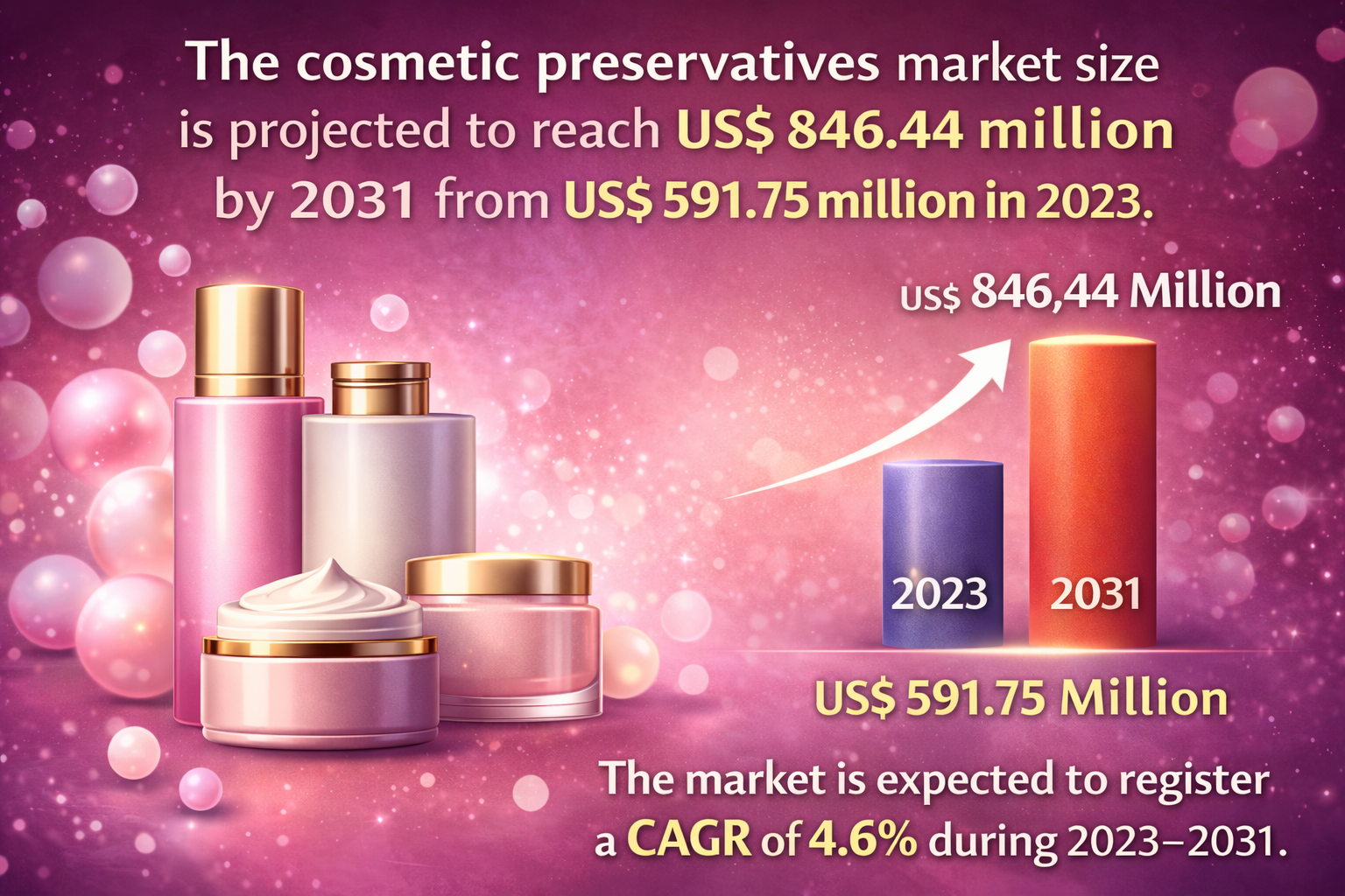 According to industry insights, the global cosmetic preservatives market was valued at US$591.75 million in 2023 and is projected to reach US$846.44 million by 2031, registering a compound annual growth rate (CAGR) of 4.6% during the forecast period from 2023 to 2031. The increasing demand for skincare and personal care products across developed and emerging economies is expected to drive the growth of the cosmetic preservatives market.