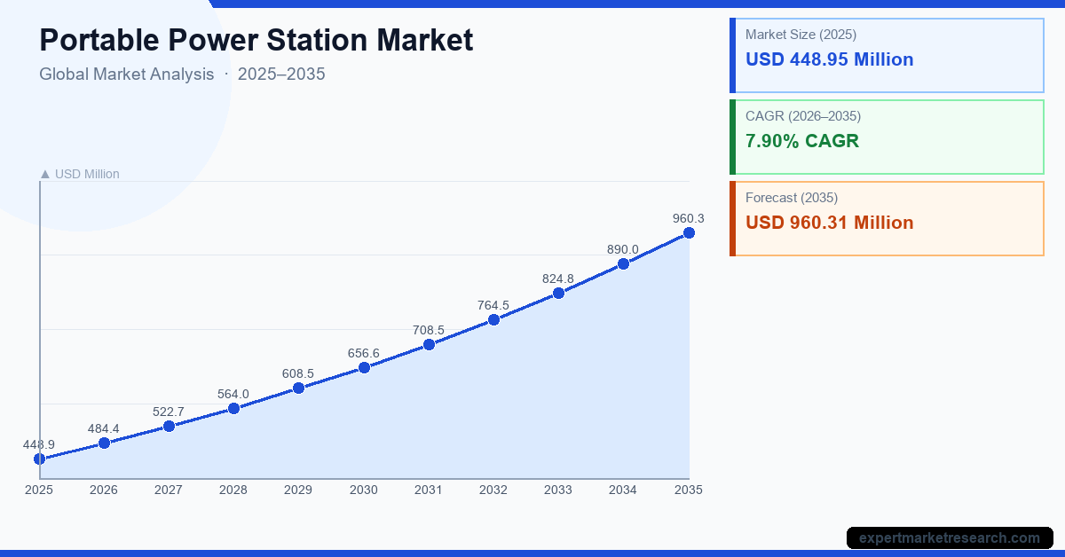 The global Portable Power Station Market was valued at USD 448.95 Million in 2025 and is projected to grow at a CAGR of 7.90% during the forecast period of 2026-2035, reaching USD 960.31 Million by 2035. The increasing adoption of clean and mobile energy solutions is significantly contributing to market expansion across residential, commercial, and industrial applications.