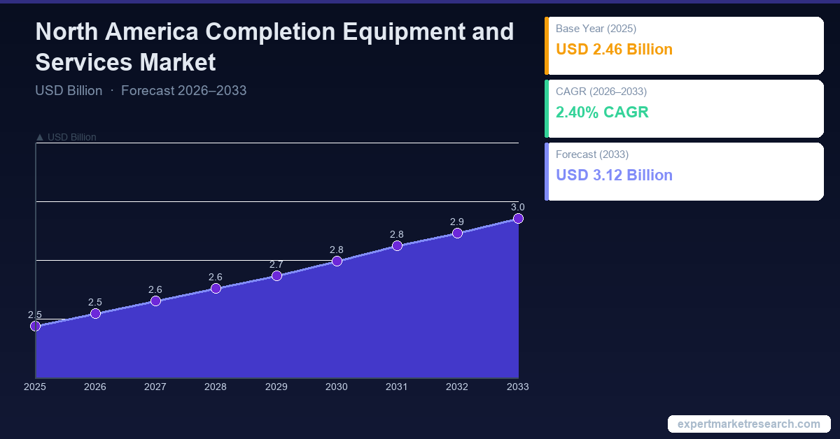 The North America Completion Equipment and Services Market was valued at USD 2.46 Billion in 2025 and is projected to grow at a CAGR of 2.40% between 2026 and 2035, reaching USD 3.12 Billion by 2035. The steady growth reflects consistent demand for oil and gas well completion activities across the region.